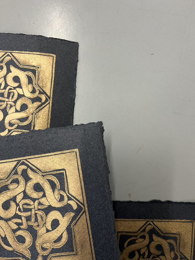 Gold ink printed on handmade black khadi paper, inspired by Andalusian ceramic tiles.