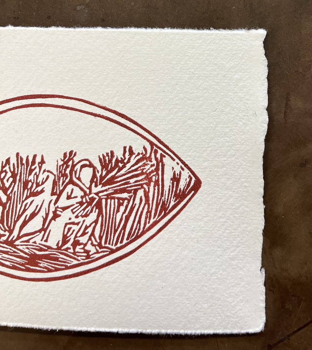 Hand carved lino print on smooth khadi paper depicting farmers working in the wheat fields.