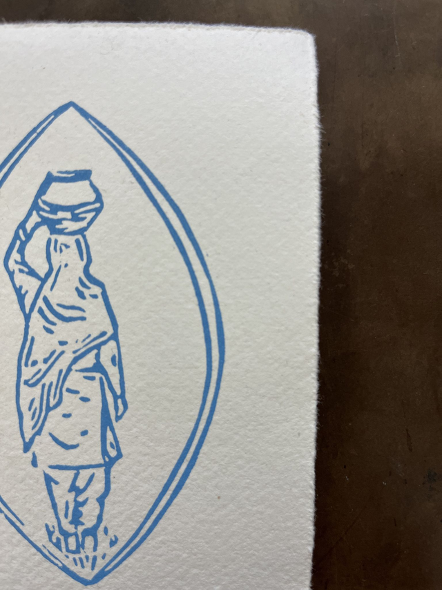 Baby blue lino print on Khadi smooth handmade paper. The illustration depicts a Pahari women collecting water from a well.
